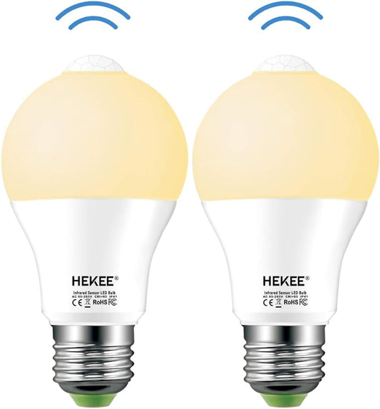 HEKEE Bombilla LED con sensor de movimiento 9W A19 PIR IR incorporado equivalente a 60W brillante 810 lúmenes base E26 bombillas de color blanco cálido (2 paquetes)