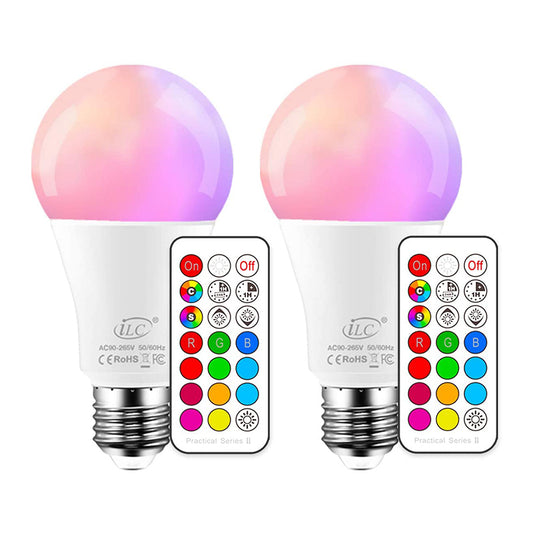 iLC Ampoules LED à changement de couleur, équivalent 70 W, blanc chaud 2 700 K A19 E26, culot à vis Edison RGBW à intensité variable – 12 choix de couleurs – Télécommande infrarouge incluse (lot de 2)